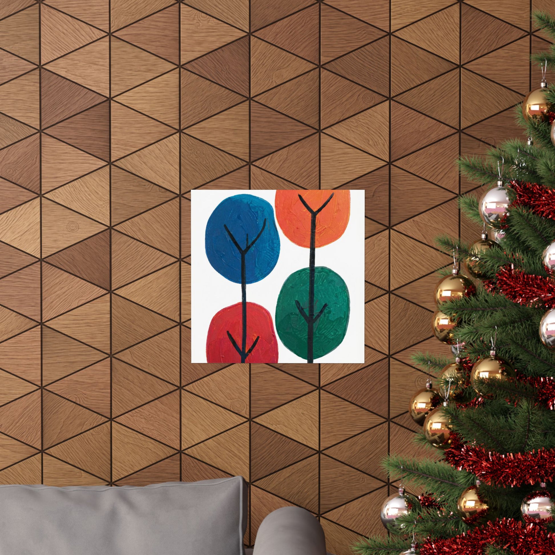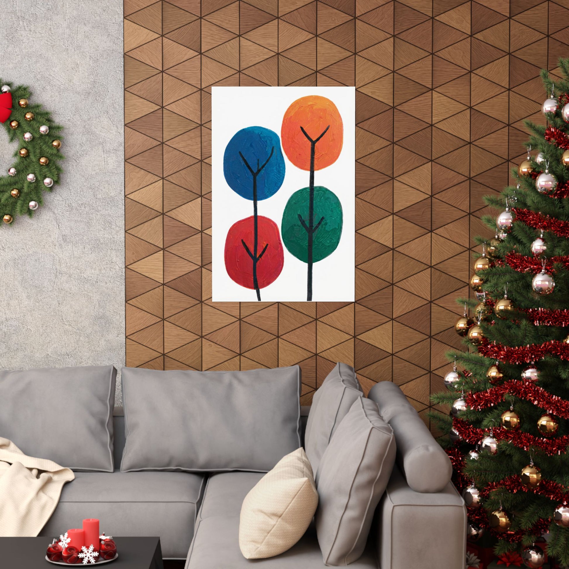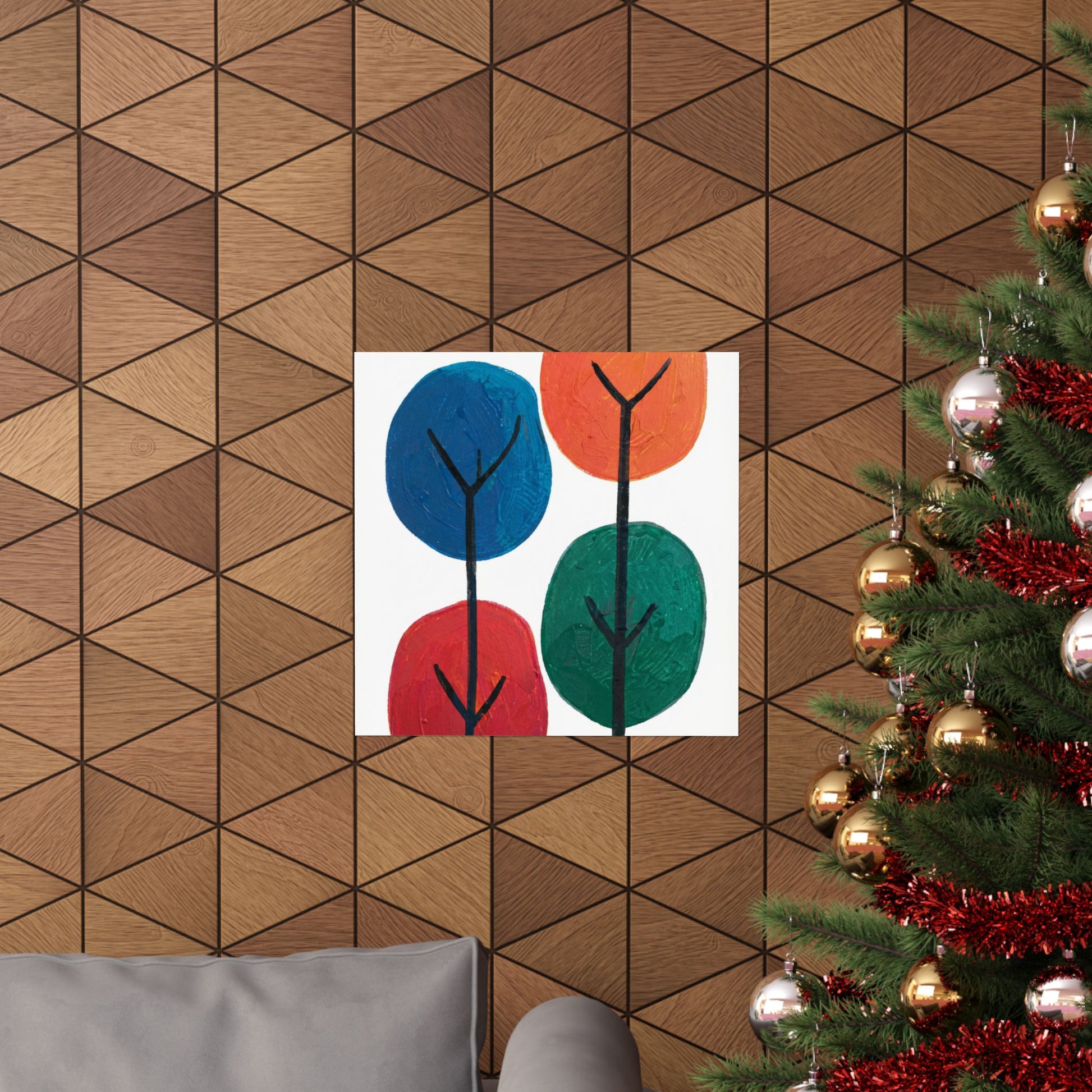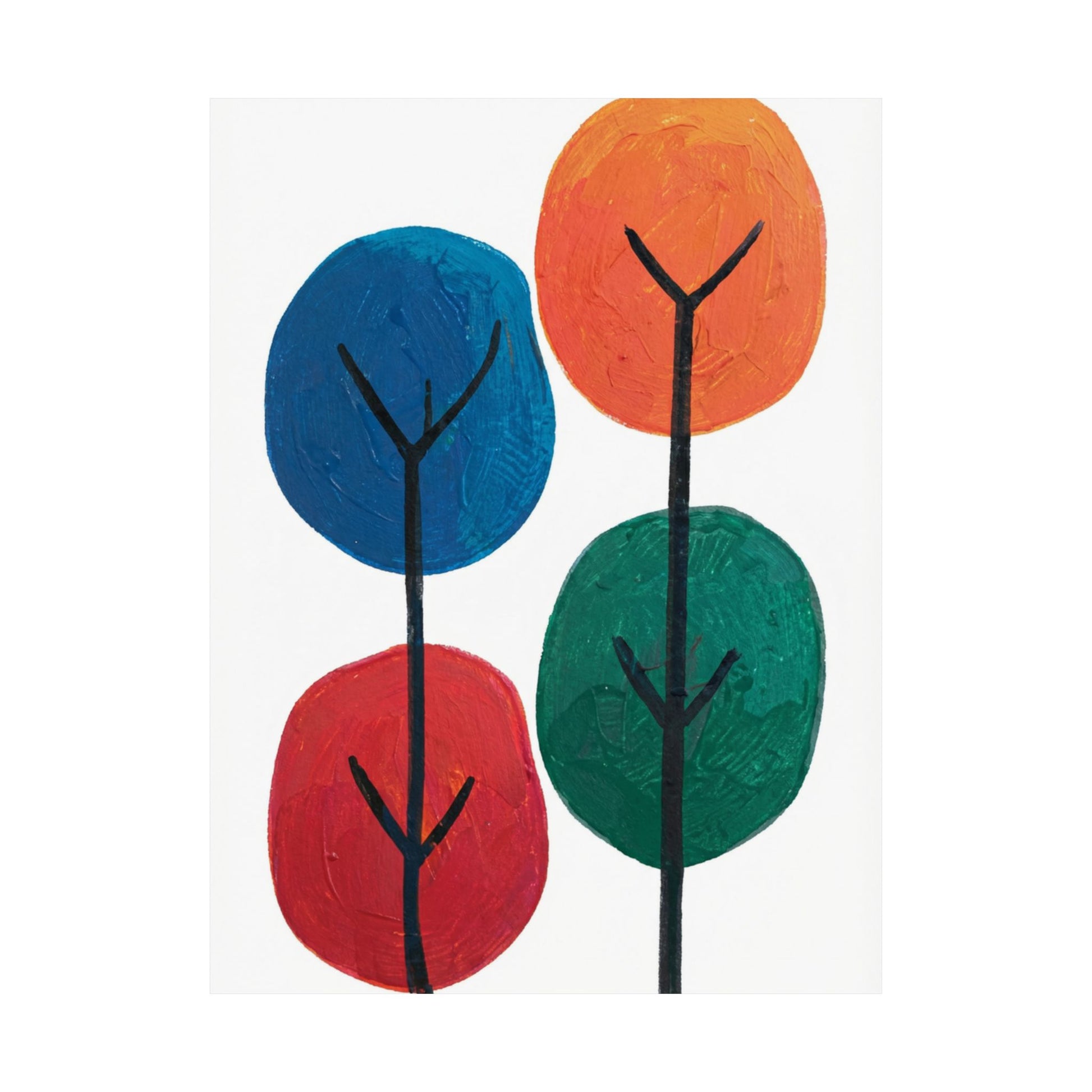 Colour Grove features four stylised painted trees in blue, orange, red, and teal, each rendered with bold, textured brushstrokes that suggest human artistry rather than machine precision. The composition is deliberately intimate—a small grove rather than a forest—set against a clean white background that gives each colour room to breathe. What makes Colour Grove work is the balance it holds: warm and cool colours coexist without conflict, playfulness meets groundedness, and the painted texture invites closer inspection. This is design that doesn't shout, but shows up everywhere you want it to. A art poster in Colour Grove becomes a focal point—not because it's loud, but because it's considered. The four trees sit in perfect balance, inviting conversation without demanding it. This is art that respects your space.