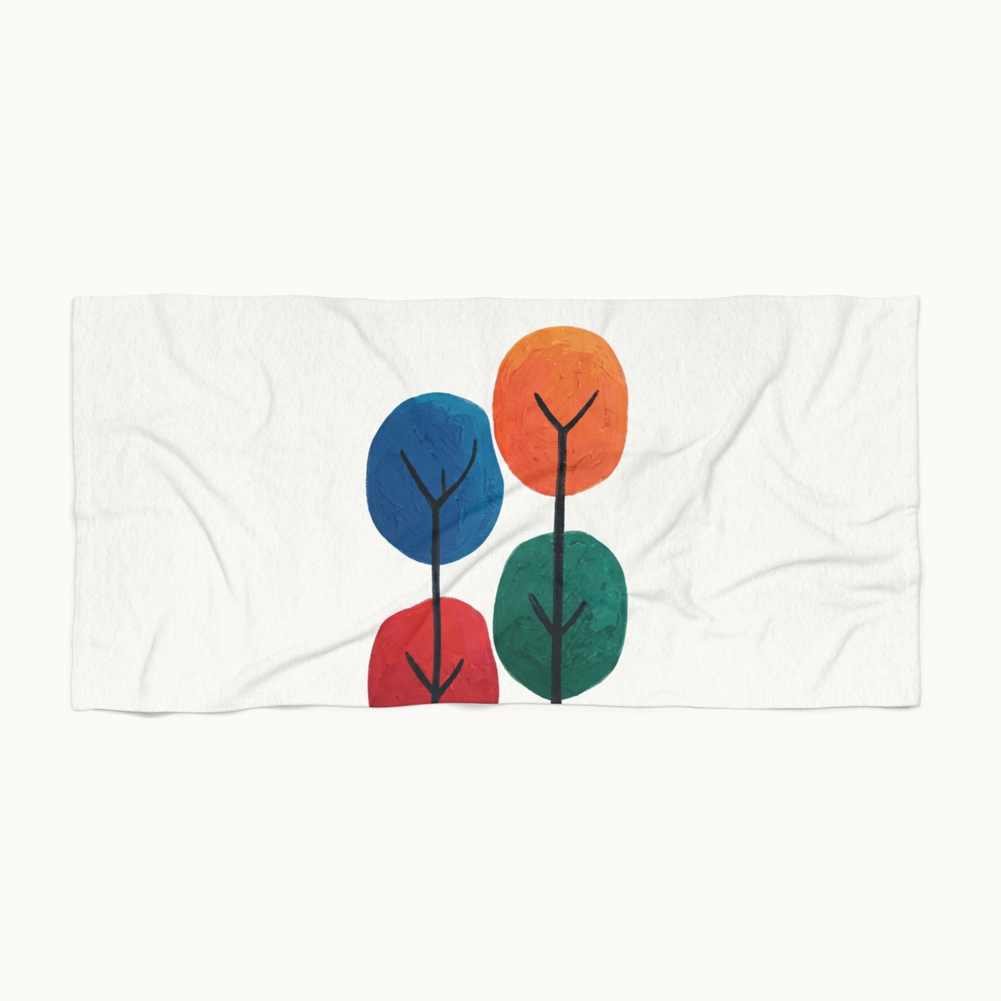 Colour Grove features four stylised painted trees in blue, orange, red, and teal, each rendered with bold, textured brushstrokes that suggest human artistry rather than machine precision. The composition is deliberately intimate—a small grove rather than a forest—set against a clean white background that gives each colour room to breathe. What makes Colour Grove work is the balance it holds: warm and cool colours coexist without conflict, playfulness meets groundedness, and the painted texture invites closer inspection. This is design that doesn't shout, but shows up everywhere you want it to. This beach towel brings the Colour Grove pattern into your everyday. Designed to work with other objects in the collection, creating a cohesive aesthetic that celebrates colour without shouting.