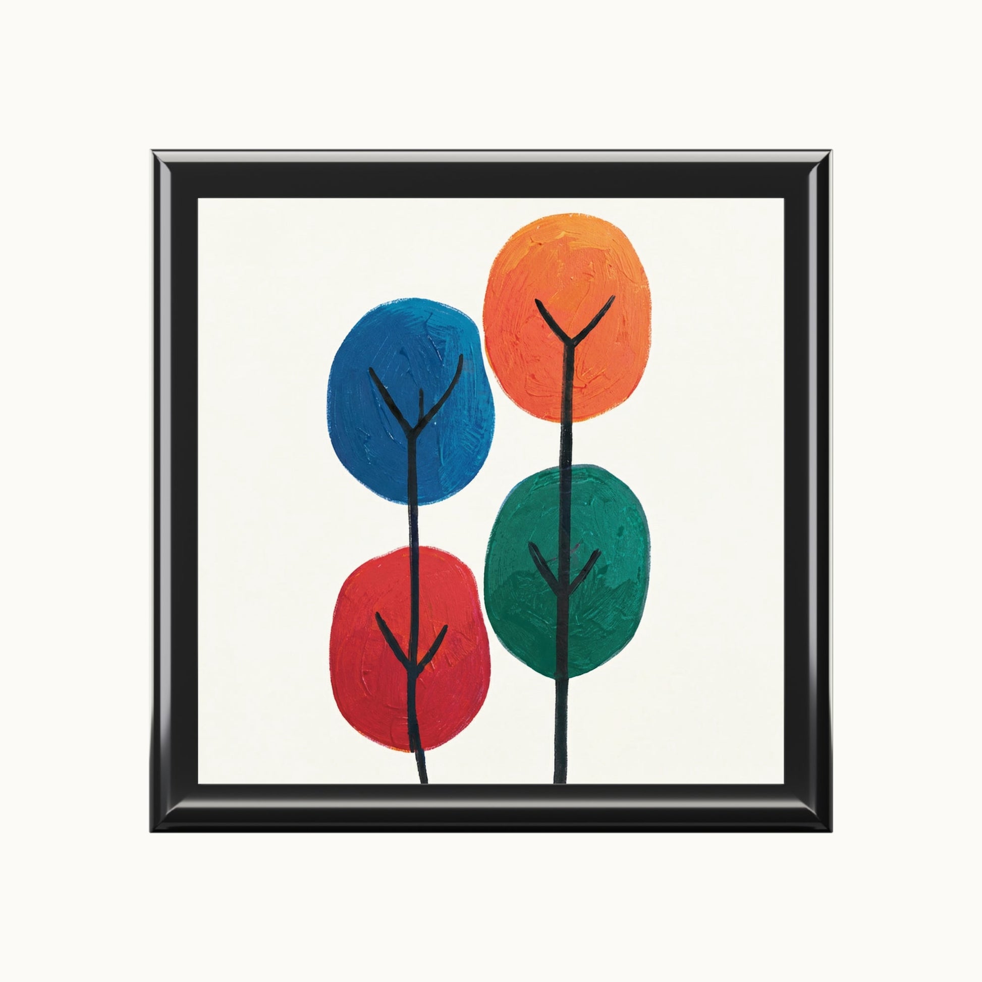 Colour Grove features four stylised painted trees in blue, orange, red, and teal, each rendered with bold, textured brushstrokes that suggest human artistry rather than machine precision. The composition is deliberately intimate—a small grove rather than a forest—set against a clean white background that gives each colour room to breathe. What makes Colour Grove work is the balance it holds: warm and cool colours coexist without conflict, playfulness meets groundedness, and the painted texture invites closer inspection. This is design that doesn't shout, but shows up everywhere you want it to. A jewelry box carries this design close to you, visible in the moments when you catch your reflection. Jewellery that makes a design statement without being loud—exactly the Géométrie approach.