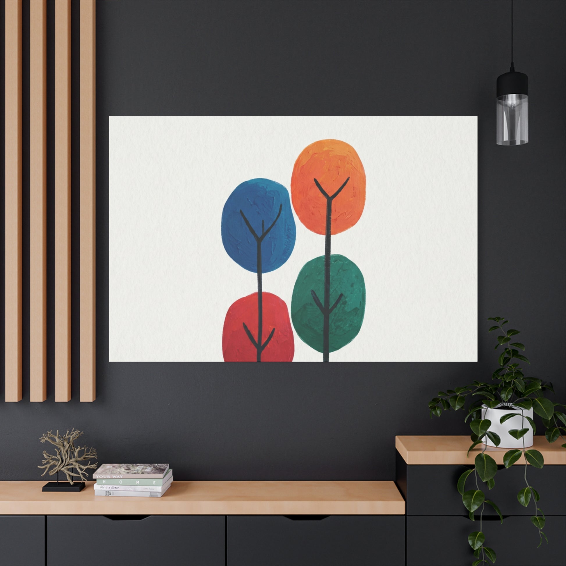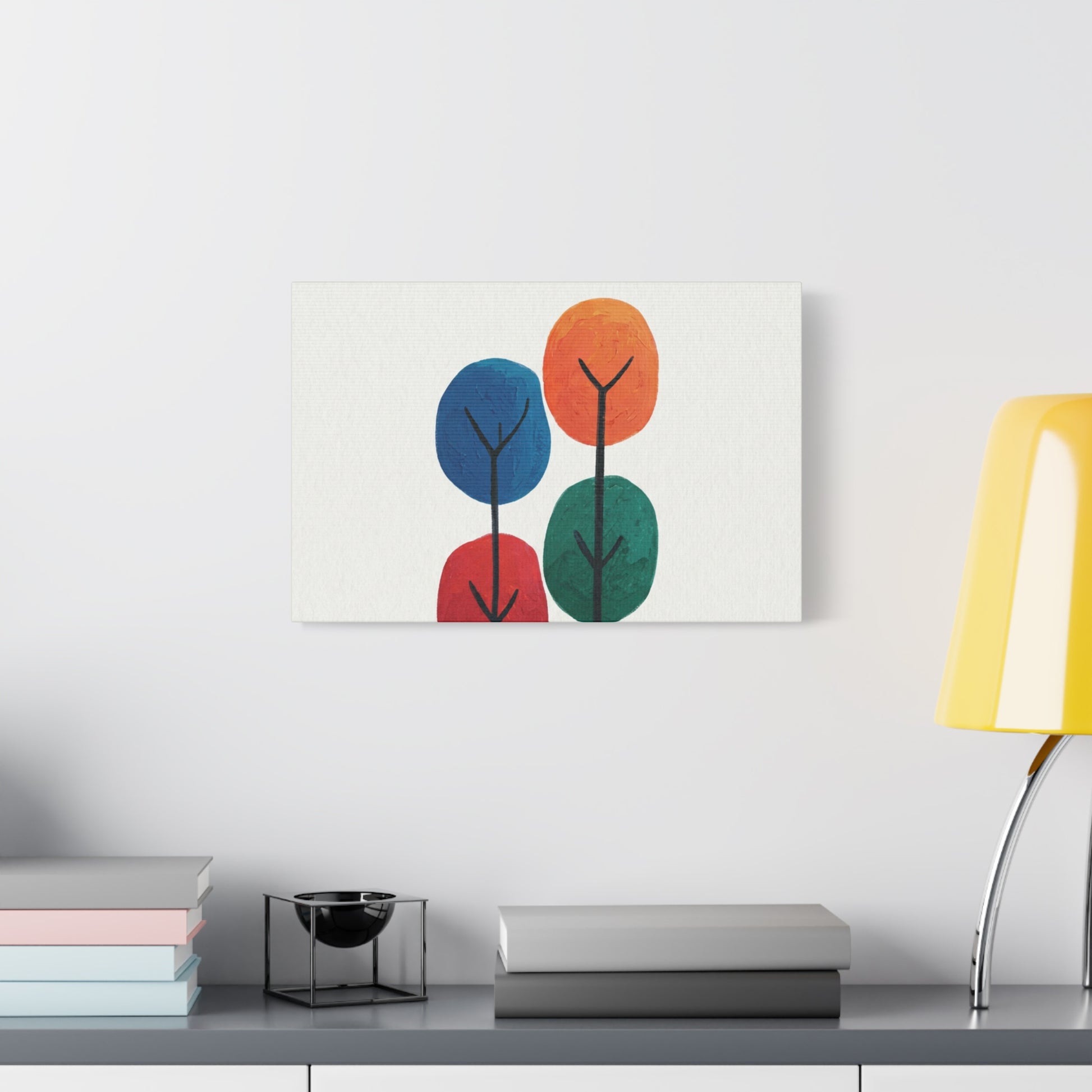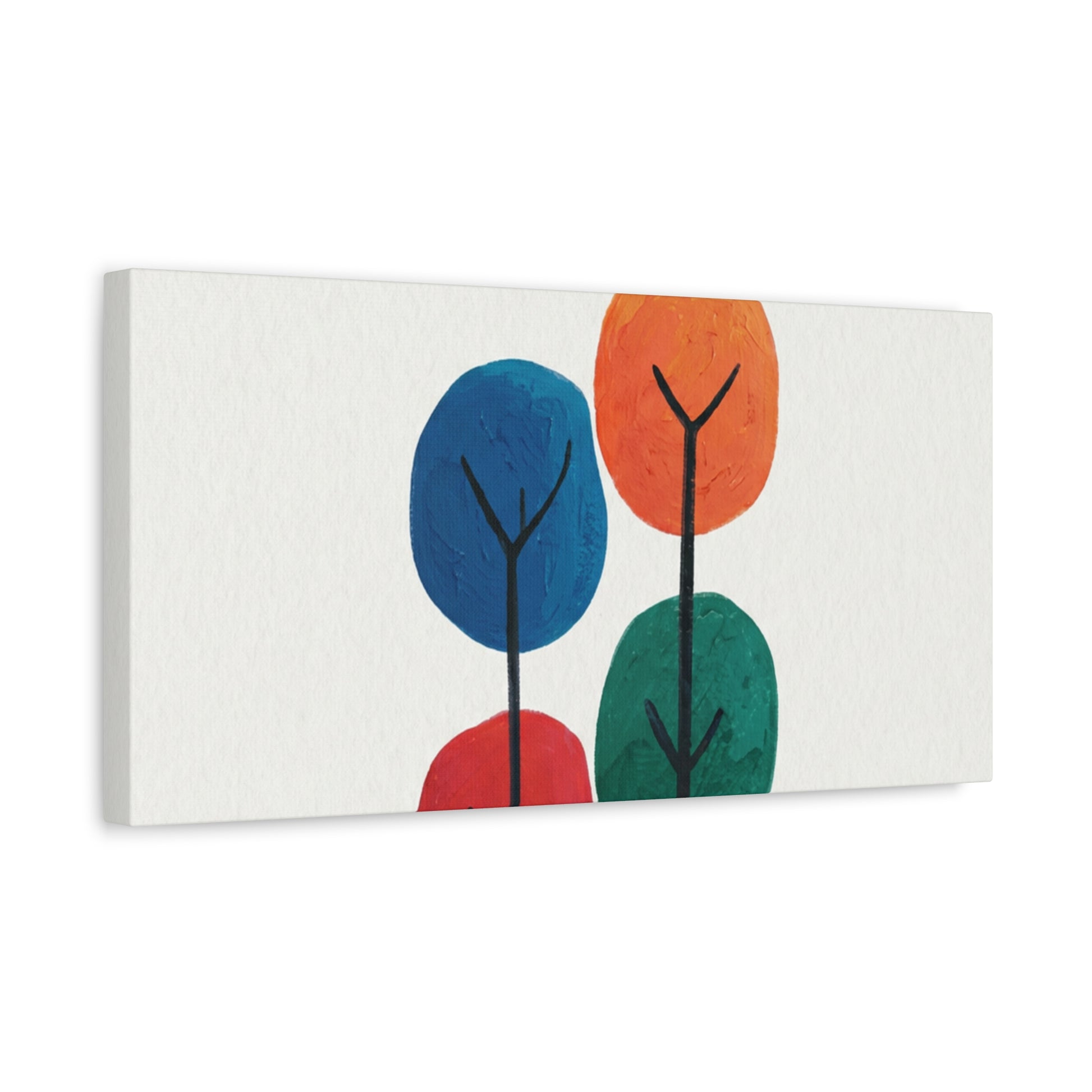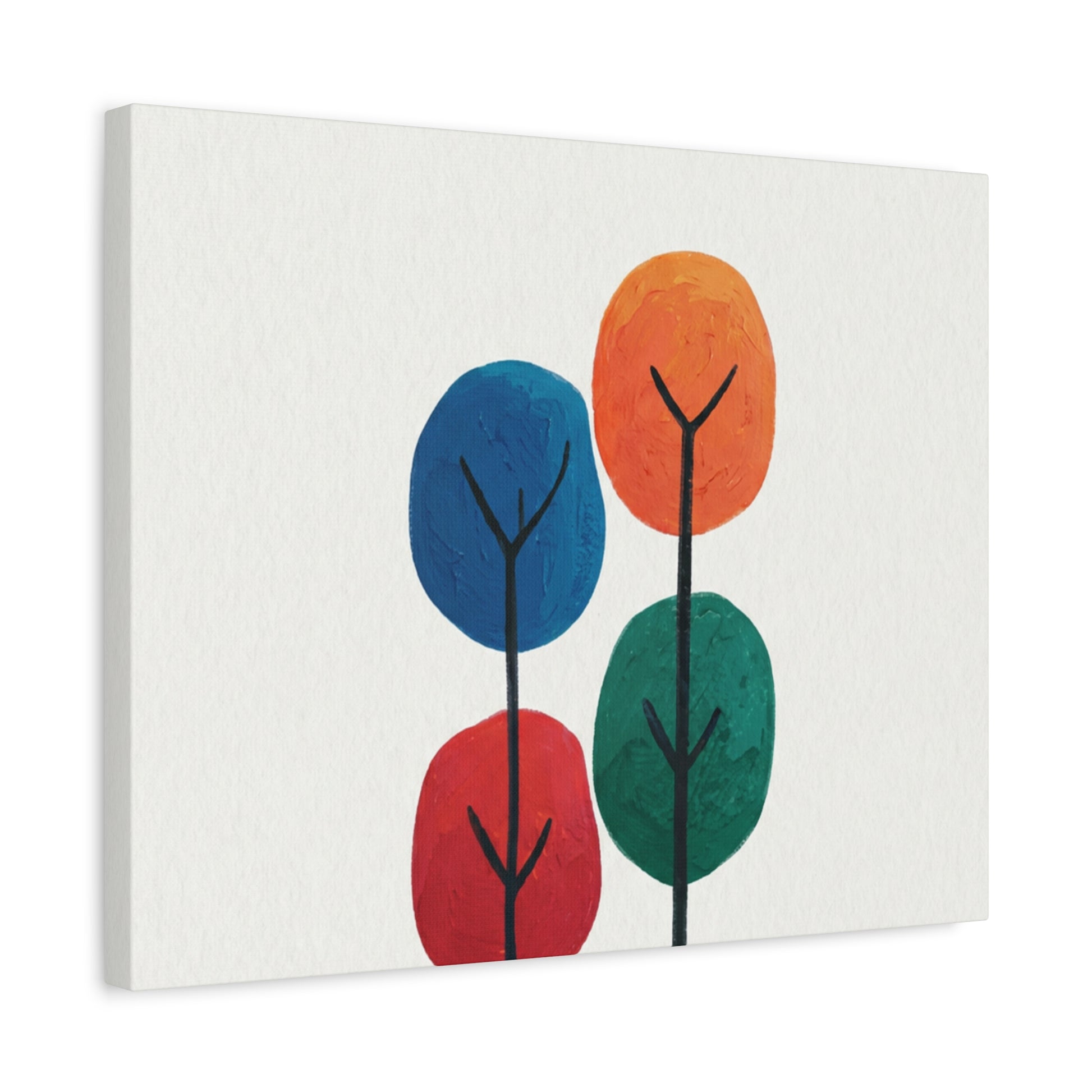 Colour Grove features four stylised painted trees in blue, orange, red, and teal, each rendered with bold, textured brushstrokes that suggest human artistry rather than machine precision. The composition is deliberately intimate—a small grove rather than a forest—set against a clean white background that gives each colour room to breathe. What makes Colour Grove work is the balance it holds: warm and cool colours coexist without conflict, playfulness meets groundedness, and the painted texture invites closer inspection. This is design that doesn't shout, but shows up everywhere you want it to. A stretched canvas wall art in Colour Grove becomes a focal point—not because it's loud, but because it's considered. The four trees sit in perfect balance, inviting conversation without demanding it. This is art that respects your space.
