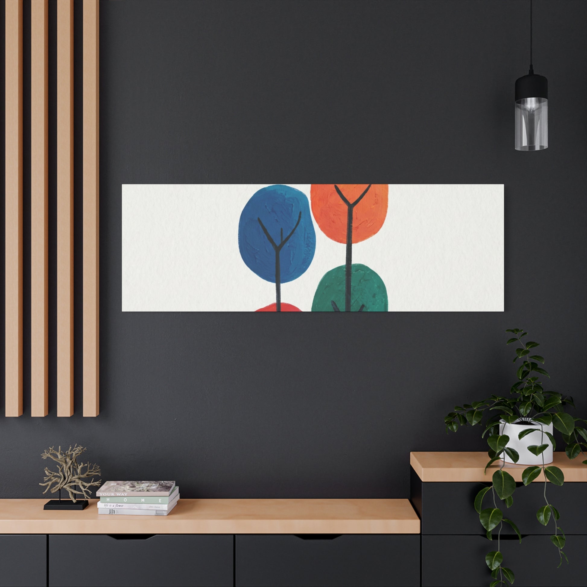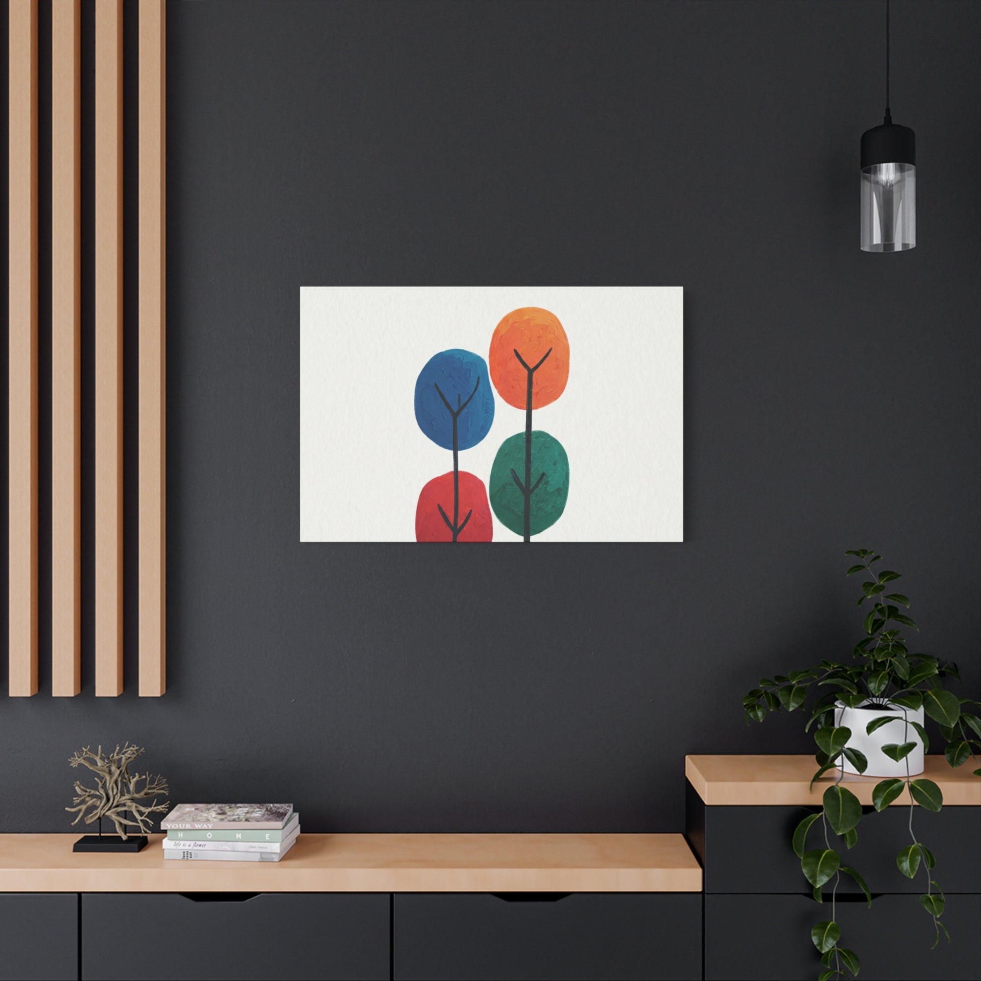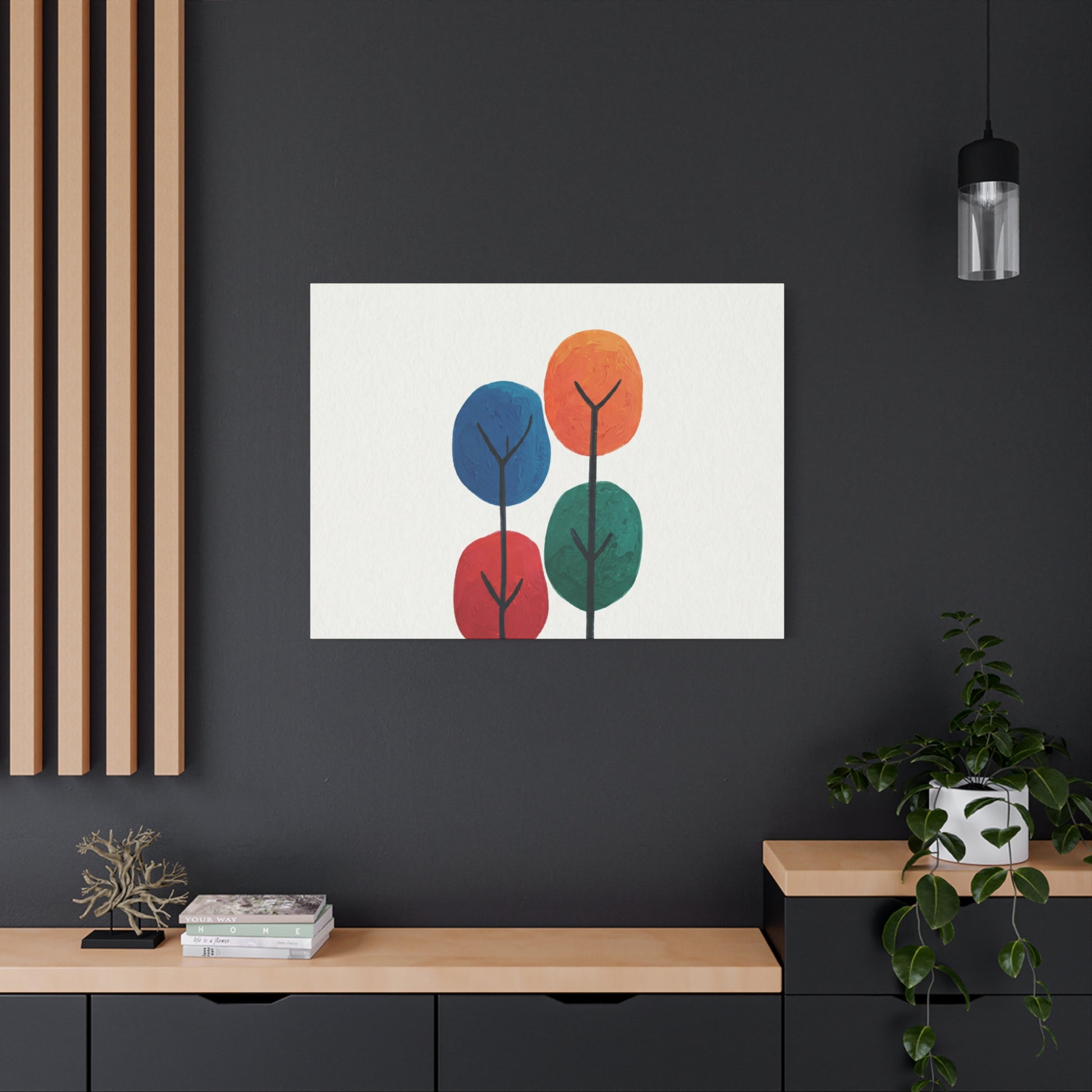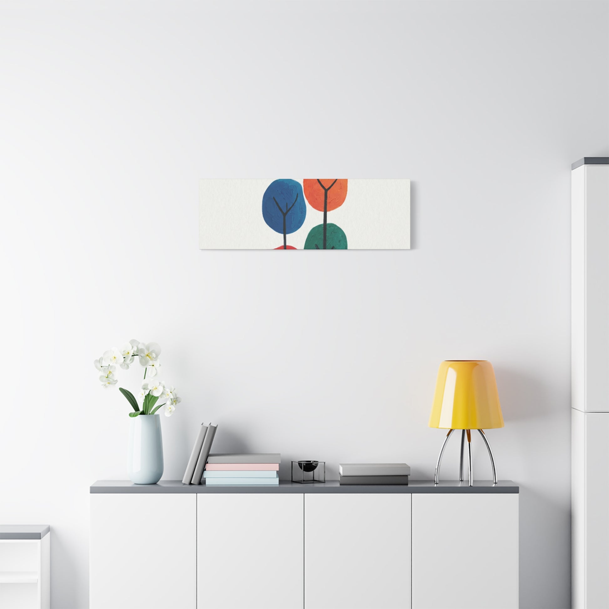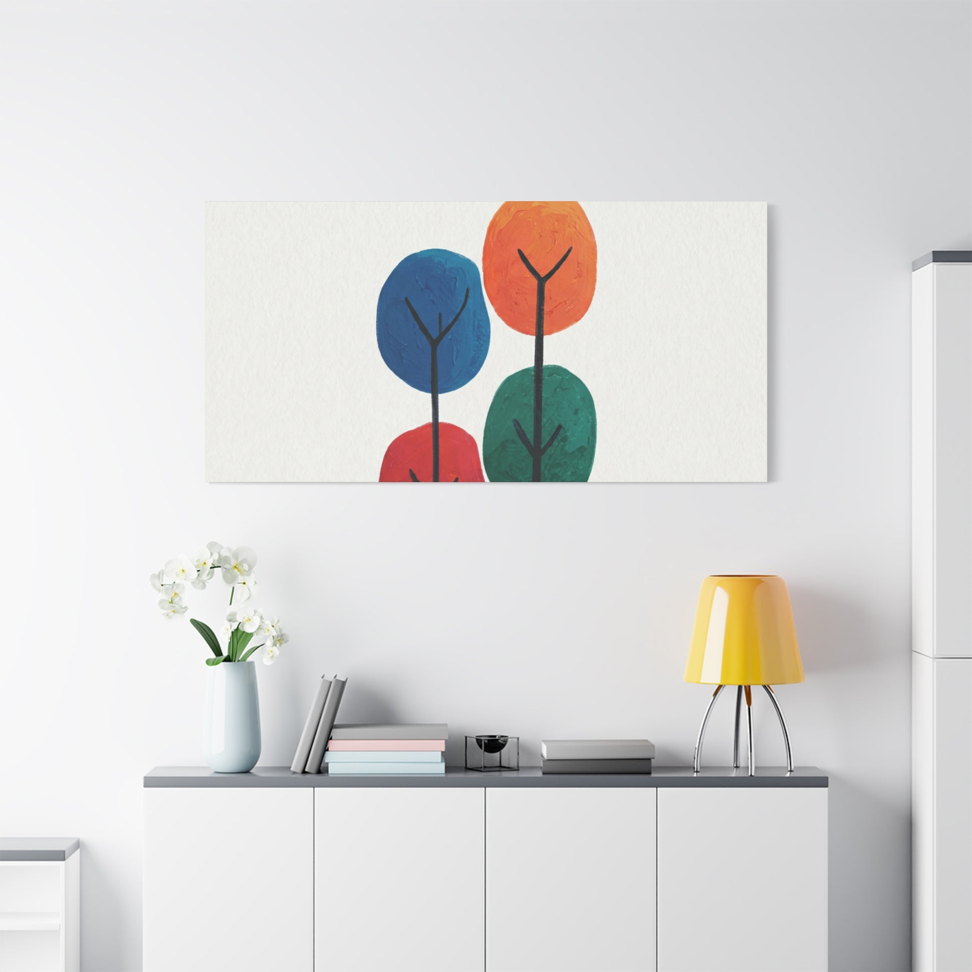 Colour Grove features four stylised painted trees in blue, orange, red, and teal, each rendered with bold, textured brushstrokes that suggest human artistry rather than machine precision. The composition is deliberately intimate—a small grove rather than a forest—set against a clean white background that gives each colour room to breathe. What makes Colour Grove work is the balance it holds: warm and cool colours coexist without conflict, playfulness meets groundedness, and the painted texture invites closer inspection. This is design that doesn't shout, but shows up everywhere you want it to. A stretched canvas wall art in Colour Grove becomes a focal point—not because it's loud, but because it's considered. The four trees sit in perfect balance, inviting conversation without demanding it. This is art that respects your space.